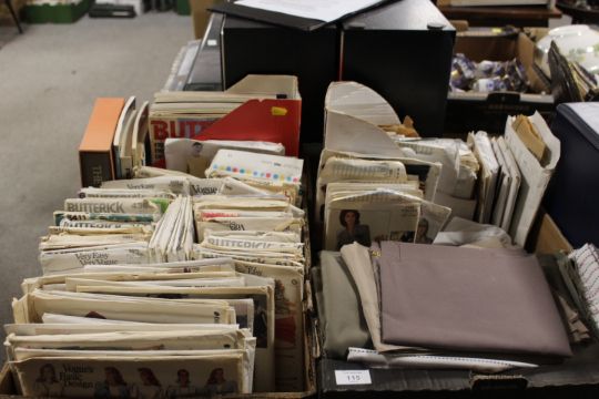 TWO TRAYS OF VINTAGE SEWING PATTERNS, FABRIC ETC TO INC VOGUE PATTERNS