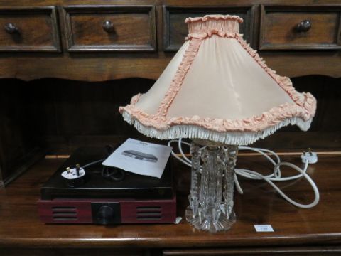A GLASS LUSTRE TABLE LAMP TOGETHER WITH A SMALL RECORD DECK (2)