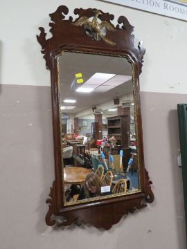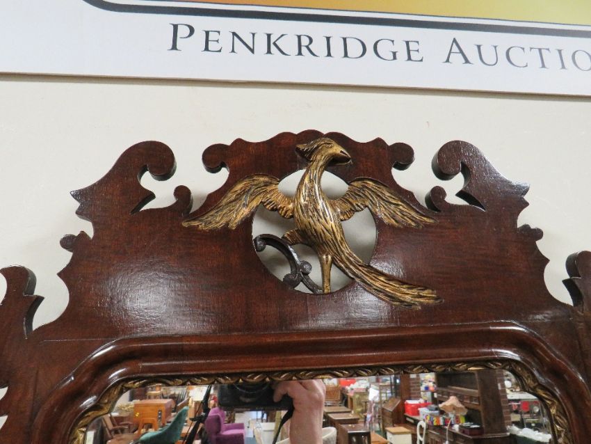 A GEORGIAN STYLE MAHOGANY WALL MIRROR WITH EAGLE SURMOUNT