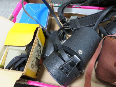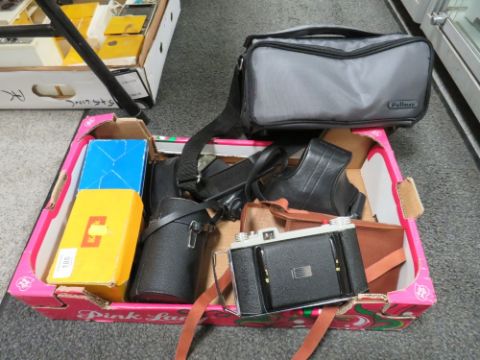 A TRAY OF PHOTOGRAPHY EQUIPMENT TO INCLUDE CAMERA, LENS ETC
