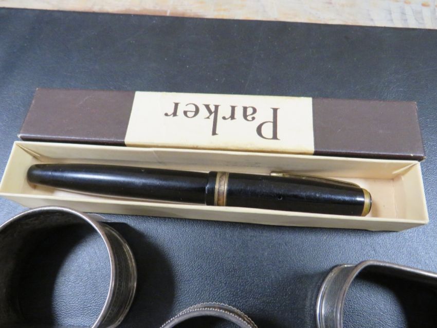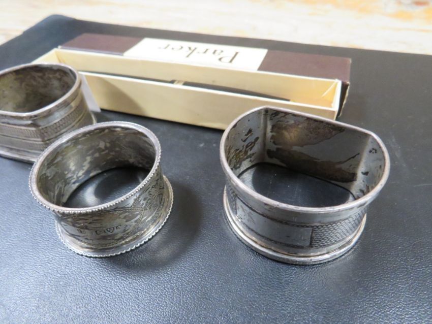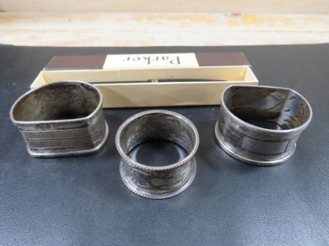 THREE HALLMARKED SILVER NAPKIN RINGS TOGETHER WITH A PARKER 14K NIBBED FOUNTAIN PEN IN ORIGINAL BOX (4)