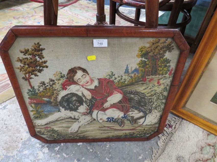 A COLLECTION OF FIVE ANTIQUE MAPLE AND MAHOGANY PICTURES, PRINTS AND TAPESTRIES