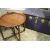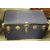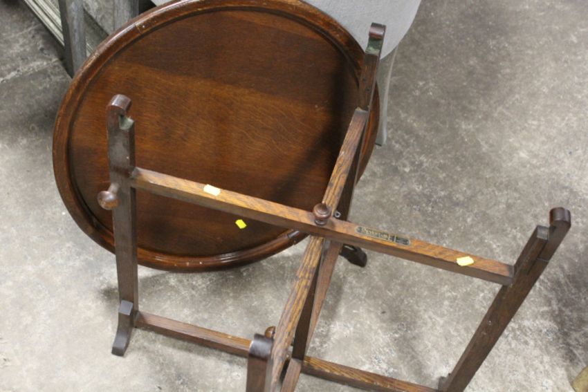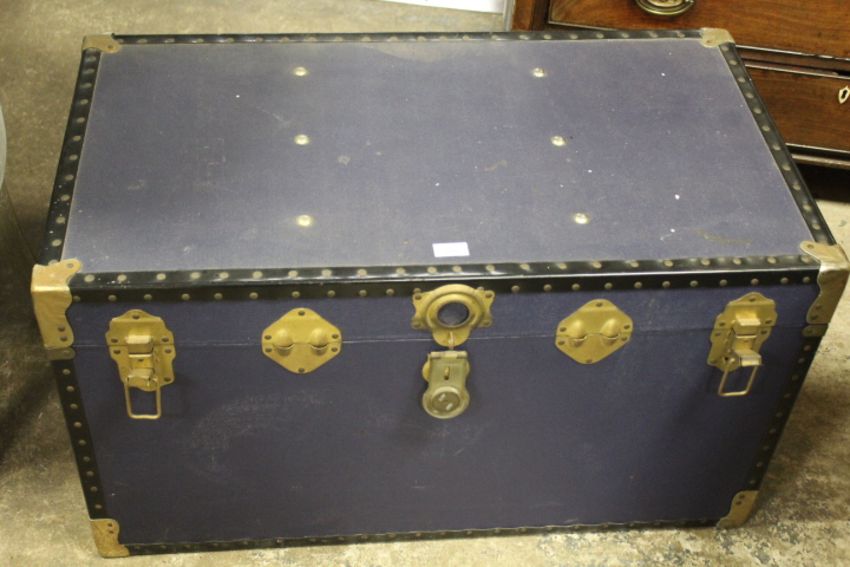 A VINTAGE BLUE PACKING TRUNK PLUS A CIRCULAR OAK CARD TABLE