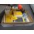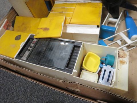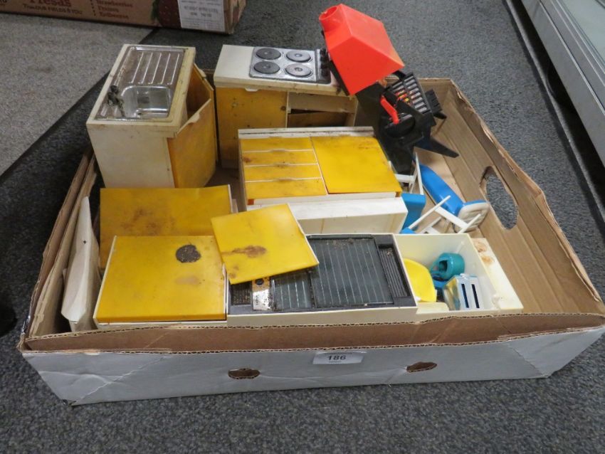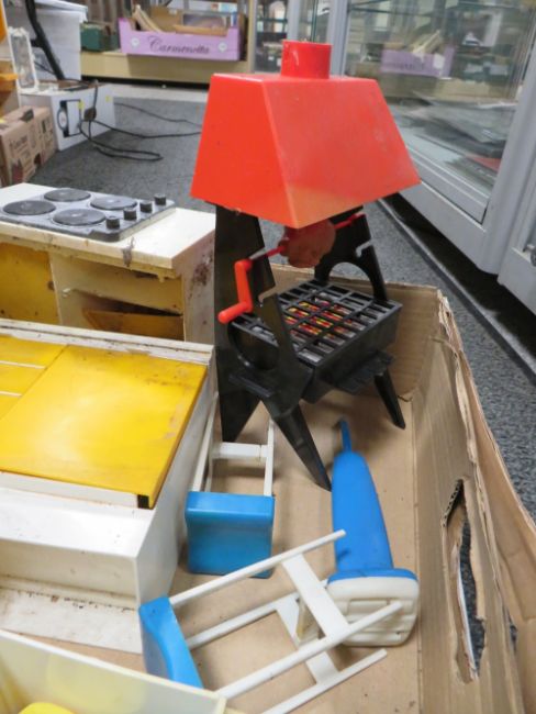 A TRAY OF VINTAGE SINDY DOLLS KITCHEN FURNITURE TO INCLUDE OUTDOOR ROTISSERIE CHICKEN STAND, BAR STOOLS, HOOVER, TOASTER ETC