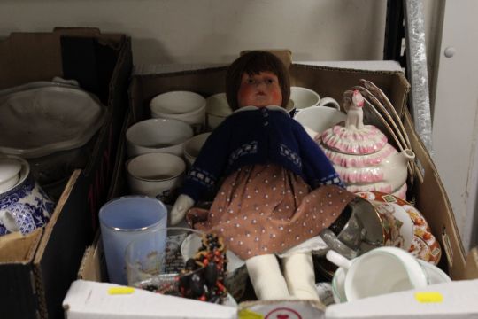 FIVE TRAYS OF ASSORTED CERAMICS & SUNDRIES TO INCLUDE SPODE BLUE AND WHITE, ROYAL DOULTON ETC & A SELECTION OF PHOTOS ETC