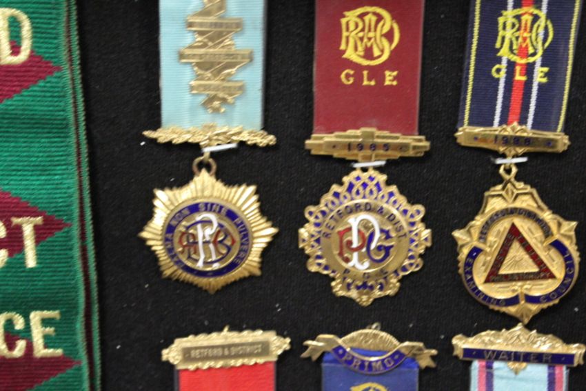 A LARGE DISPLAY CASE CONTAINING ROAB SASHES AND MEDALS RELATING TO RETFORD & DISTRICT 1980 & 1985