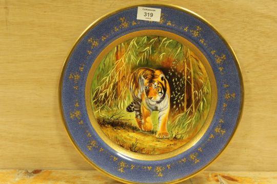 A SIGNED, HANDPAINTED AND GILDED COALPORT PLATE FEATURING A TIGER SIGNED M PINTER