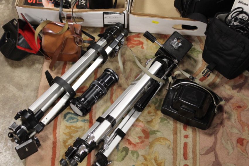 TWO TRAYS OF PHOTOGRAPHIC EQUIPMENT TO INCLUDE NIKON CAMERA ZOOM SLIDE DUPLICATOR TRIPOD STANDS ETC.