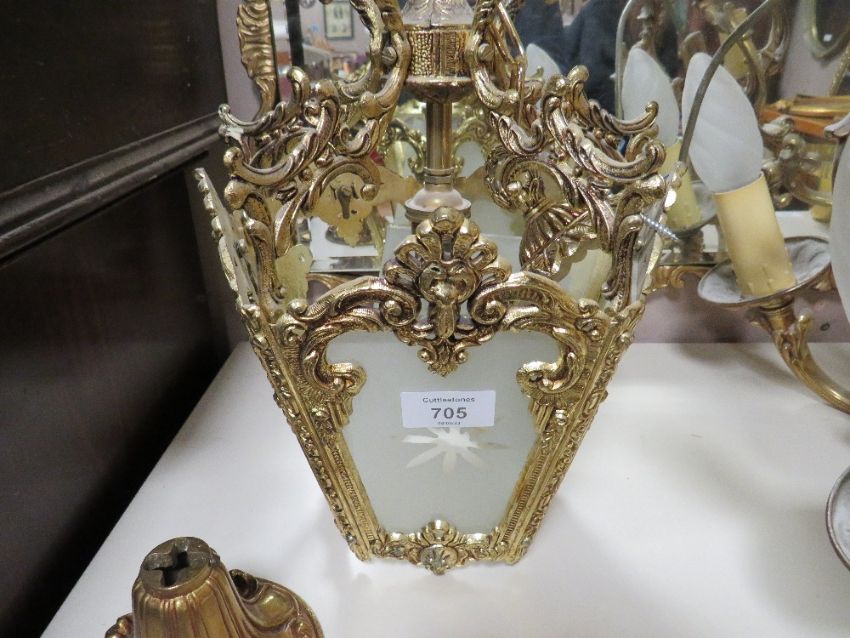 A BRASS LANTERN LIGHT FITTING TOGETHER WITH TWO HEAVY CHANDELIERS A/F