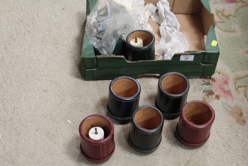 A SMALL TRAY OF LEATHER BOUND DICE SHAKERS AND DICE .ETC.