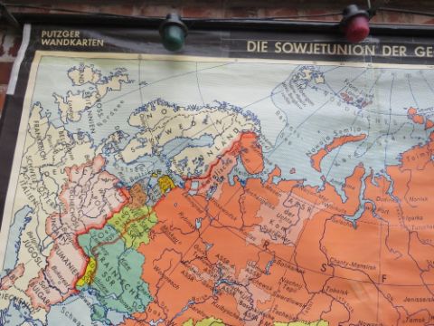 A LARGE ROLLABLE WALL MAP BY VELHAGEN & KLASING 1961 SHOWING THE SOVIET UNION AT THE TIME - 193 X 134 CM