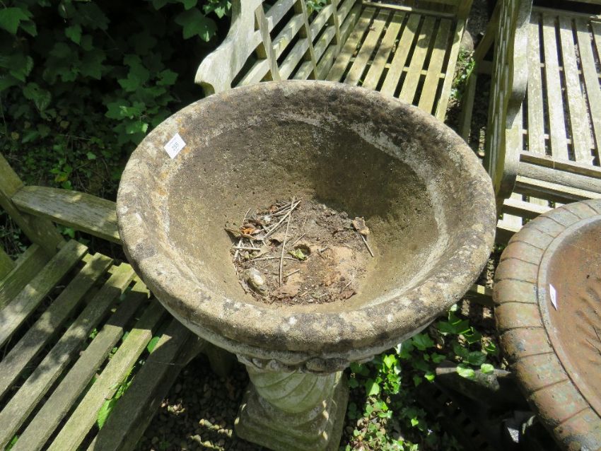 A STONE PLANTER ON RIBBED PLINTH, H 89 cm