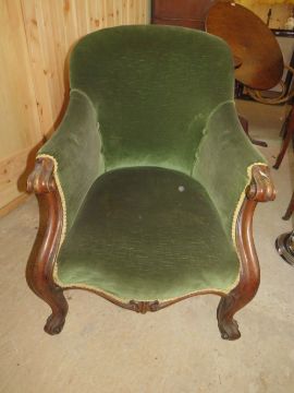 A VICTORIAN MAHOGANY FRAMED UPHOLSTERED ARMCHAIR WITH CARVED DETAIL