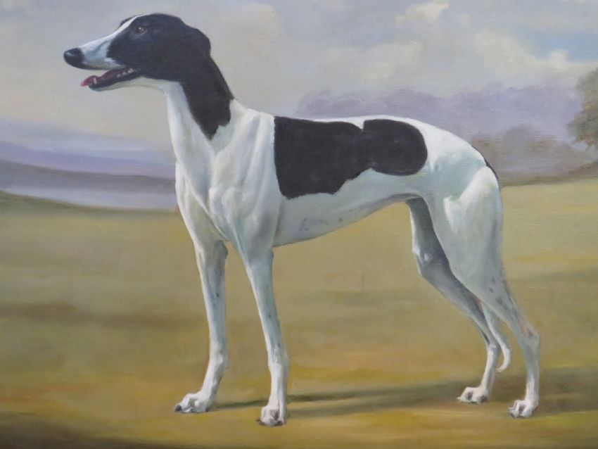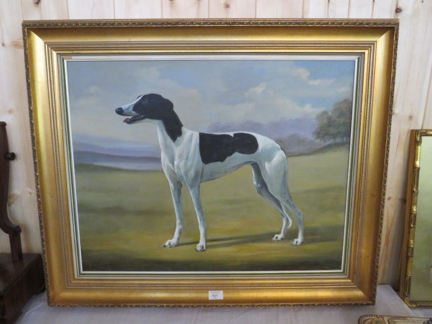 A 20TH CENTURY OIL ON CANVAS DEPICTING A BLACK AND WHITE DOG, 50 x 70 cm