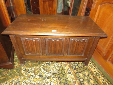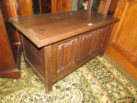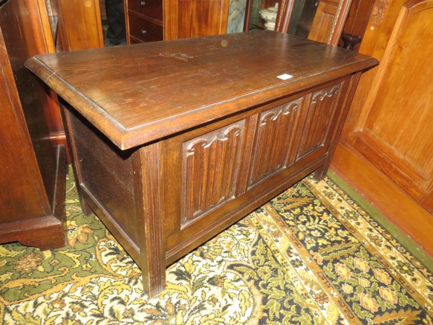 A 20TH CENTURY SMALL OAK LINENFOLD COFFER, W 90 cm