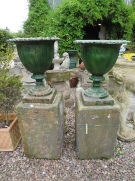 A PAIR OF GREEN PAINTED CAST LOBED URNS, H 52 cm, raised on two sandstone bases, Overall H 106 cm (2)