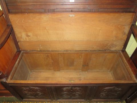 AN ANTIQUE CARVED OAK MONKS BENCH WITH LIFT-UP SEAT,W 125 cm