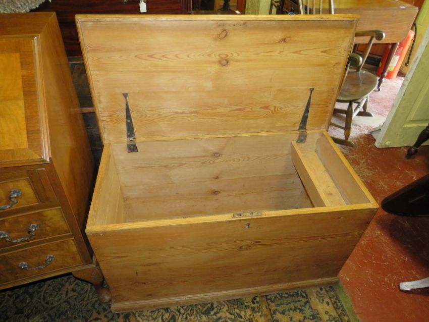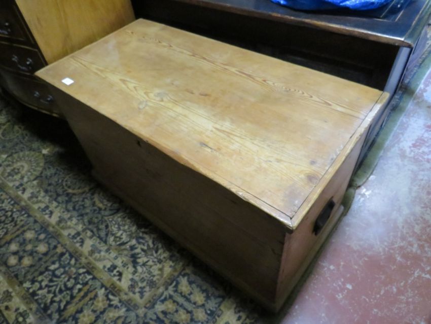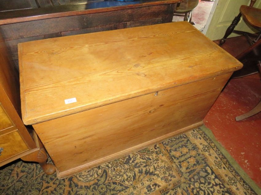 AN ANTIQUE PINE BLANKET BOX, W 97 cm