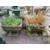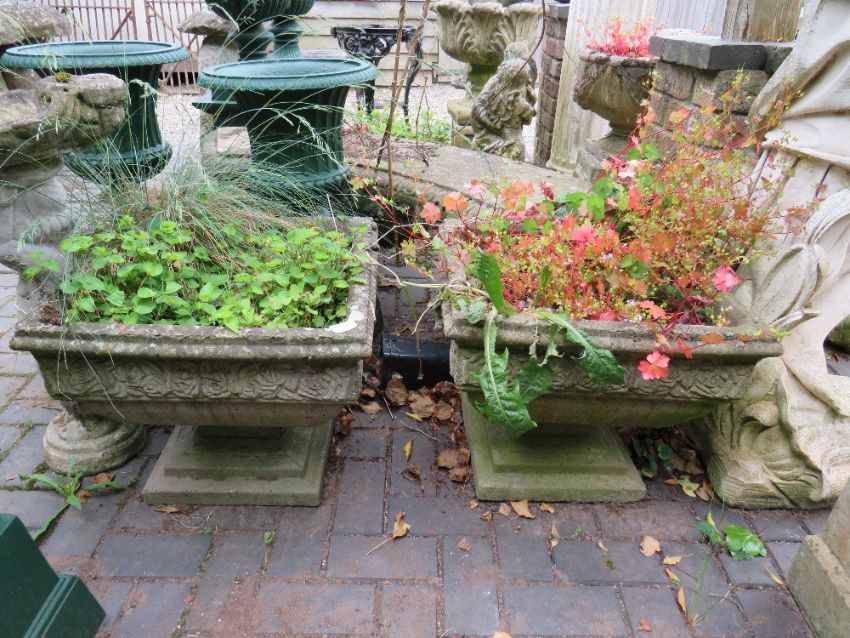 A PAIR OF SQUARE GARDEN URNS ON PLINTHS