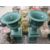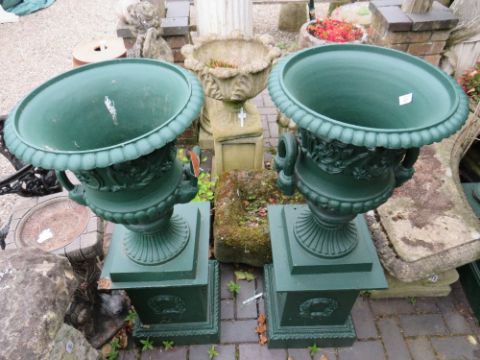 A PAIR OF GREEN PAINTED CAST CAMPANA URNS ON STANDS, H 110 cm (2)