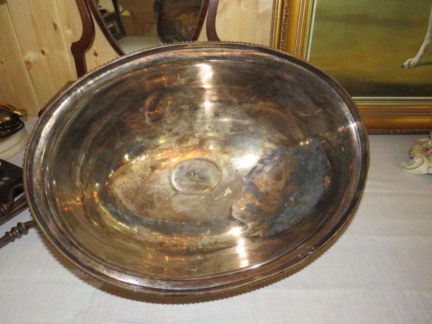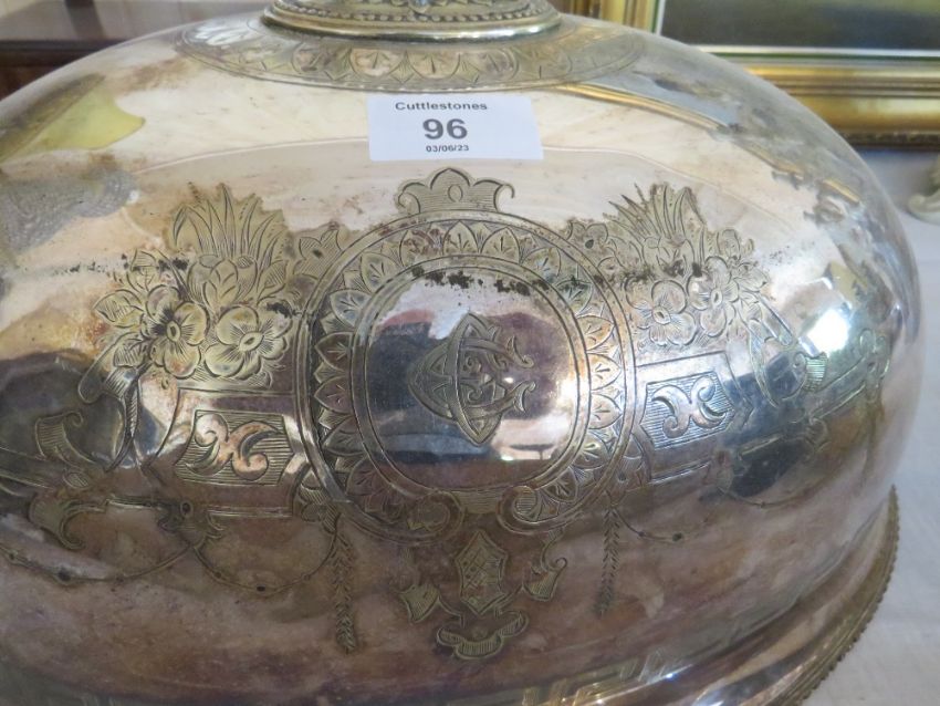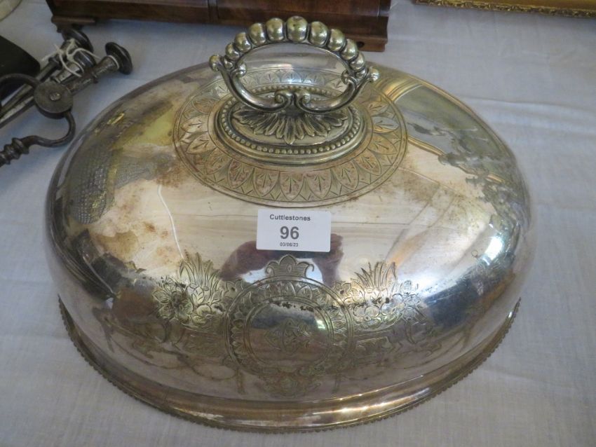 AN ANTIQUE LARGE SILVER PLATED SERVING DOME WITH ENGRAVED ARMORIAL DETAIL, W 41 cm