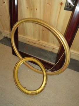 AN ANTIQUE RECTANGULAR PICTURE FRAME- REBATE 50 x 73 cm TOGETHER WITH TWO OVAL GILT FRAMES (3)