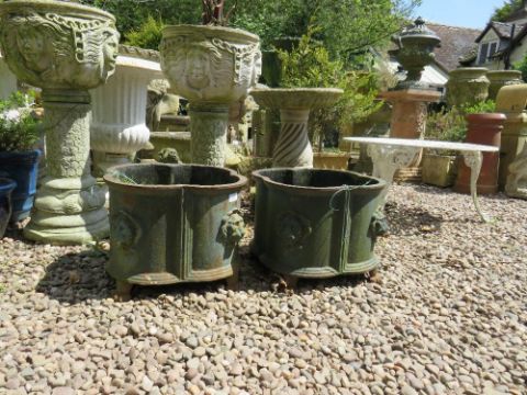 A PAIR OF CAST IRON SHAPED LOW PLANTERS, H 30 cm, W 43 cm (2)