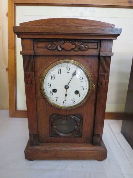 AN EARLY 20TH CENTURY OAK CASED MANTEL CLOCK, STRIKING ON A BELL, H 38.5 cm