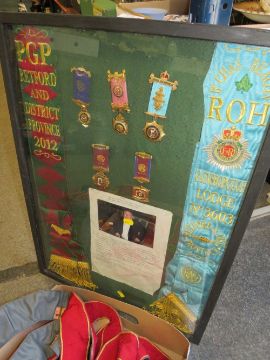 A DISPLAY CASE CONTAINING ROAB SASHES AND MEDALS RELATING TO RETFORD & DISTRICT 2012 AND GAINSBOROUGH LODGE TOGETHER WITH A COLLECTION OF ROAB ROYAL BUFFALO SASHES WITH METAL ENAMELLED BADGES