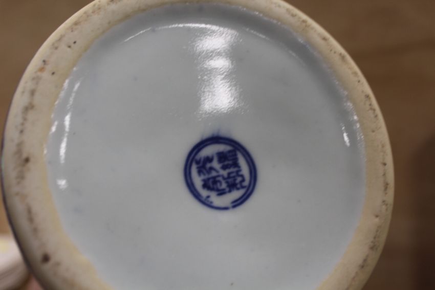 A PAIR OF CHINESE BLUE AND WHITE CERAMIC BRUSH POT VASES BOTH DECORATED ALL ROUND IN SCRIPT