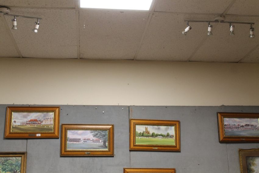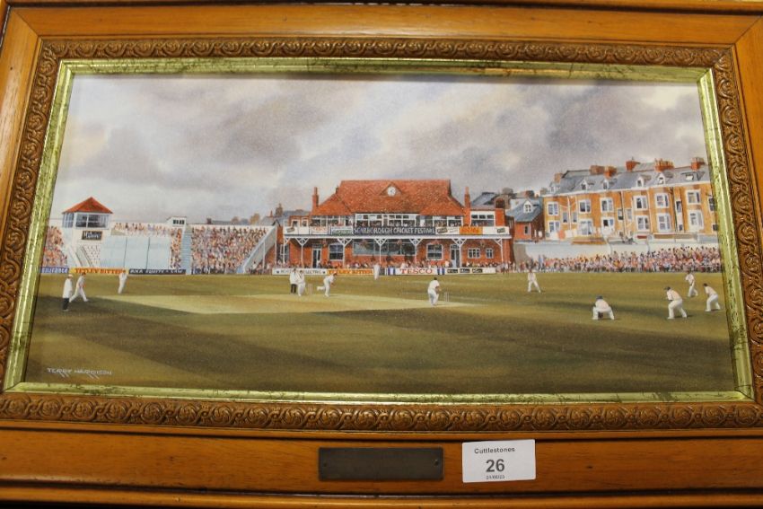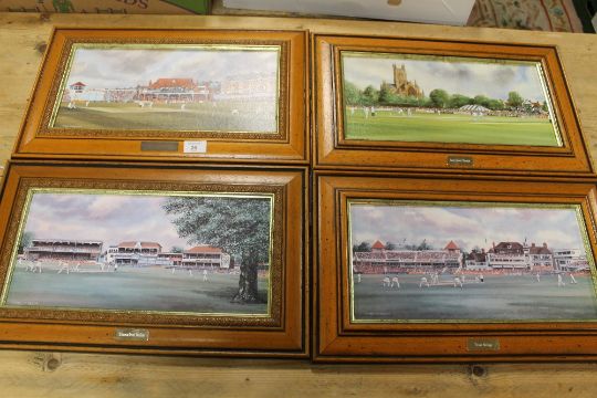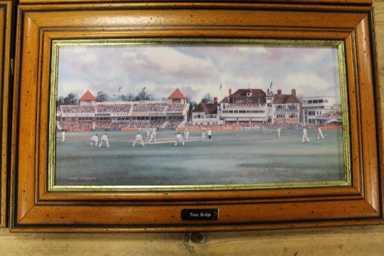 A COLLECTION OF FOUR PRINTS OF FAMOUS CRICKET GROUNDS BY TERRY HARRISON - EACH WITH A SMALL ENGRAVED PLAQUE, CONSISTING OF SCARBOROUGH CANTERBURY WORCESTER AND TRENT BRIDGE