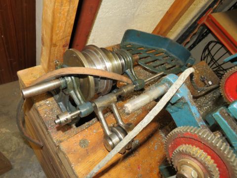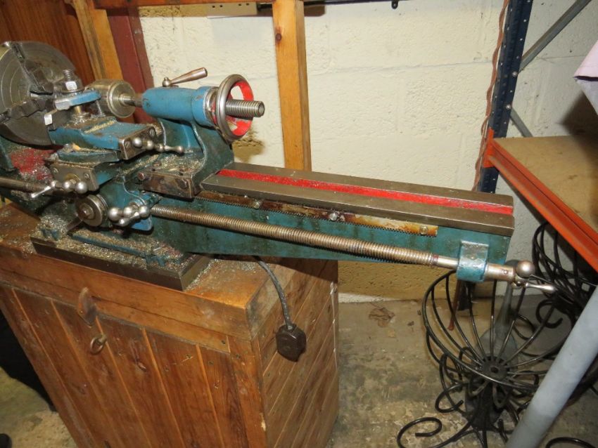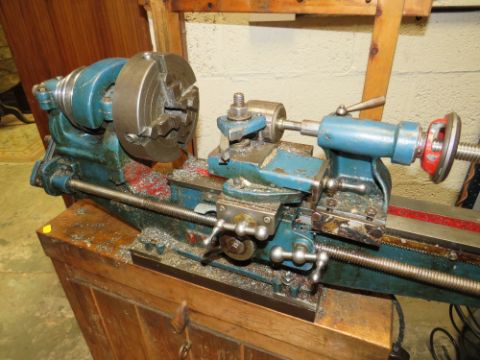 A MYFORD METALWORKING LATHE ON WOODEN PLINTH COMPLETE WITH FOUR JAW CHUCK AND ELECTRIC MOTOR 240V