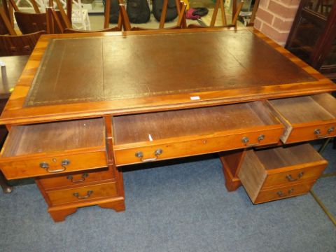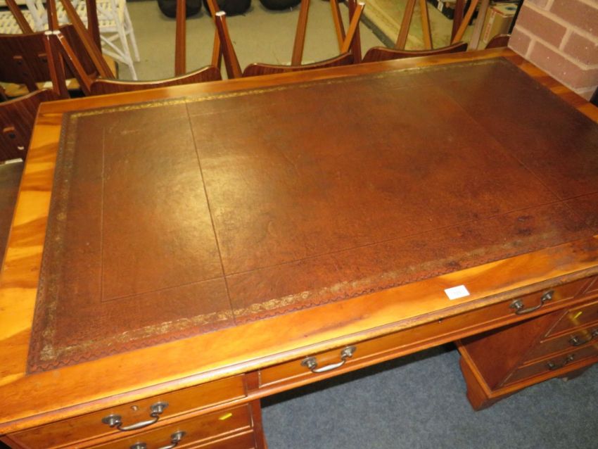 A 20TH CENTURY YEW LEATHER TOPPED TWIN PEDESTAL DESK H-77 W-152 D-90 CM