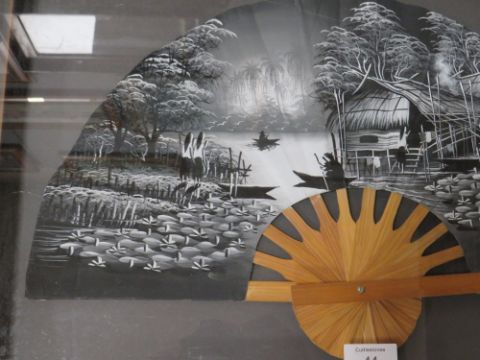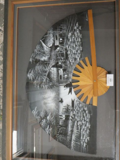 A FRAMED AND GLAZED ORIENTAL HAND PAINTED FAN, SIGNED LOWER LEFT