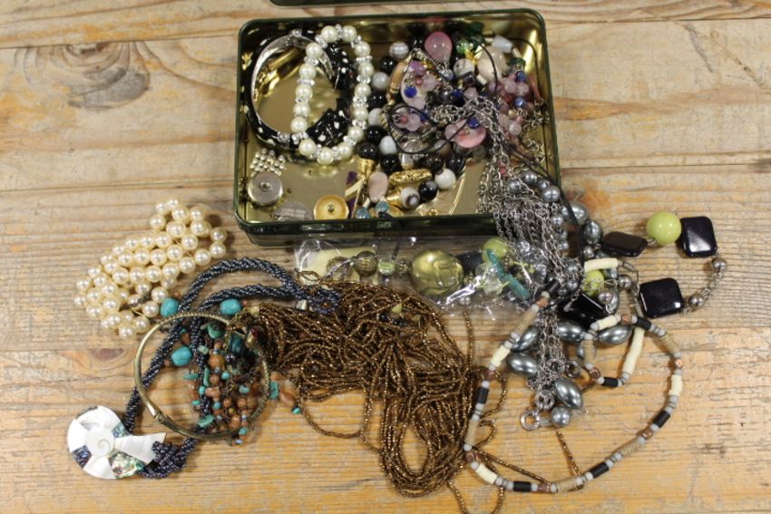 A SMALL TIN OF ASSORTED COSTUME JEWELLERY