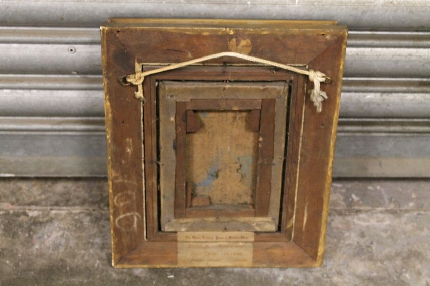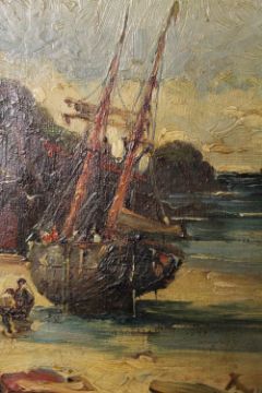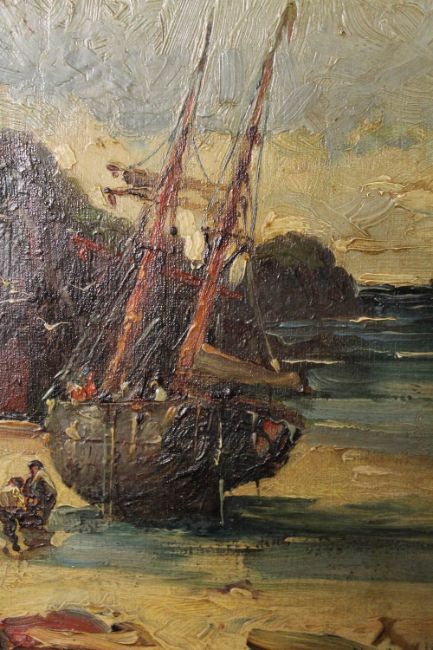 A SMALL GILT FRAMED OIL ON CANVAS OF A BEACHED SAIL SHIP WITH FRAMERS LABEL FROM DUNDEE VERSO