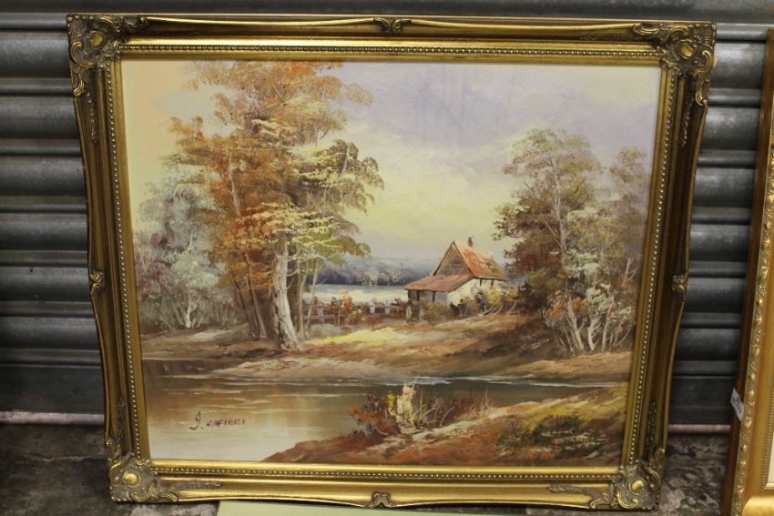 A GILT FRAMED OIL ON CANVAS OF A WATERSIDE COTTAGE SCENE SIGNED LOWER LEFT CAFIERI TOGETHER WITH A SELECTION OF PICTURES AND PRINTS