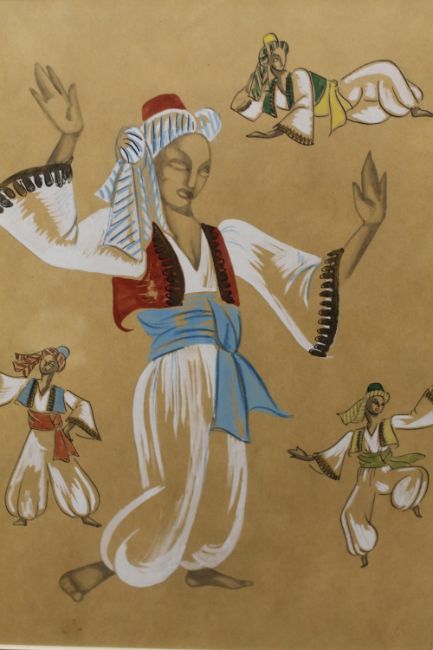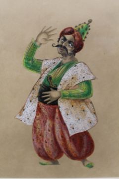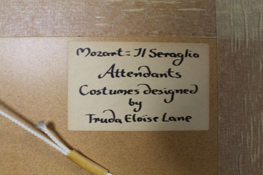 TWO GILT FRAMED AND GLAZED MIXED MEDIA STUDIES OF COSTUME DESIGNS WITH DETAILS LABELLED VERSO