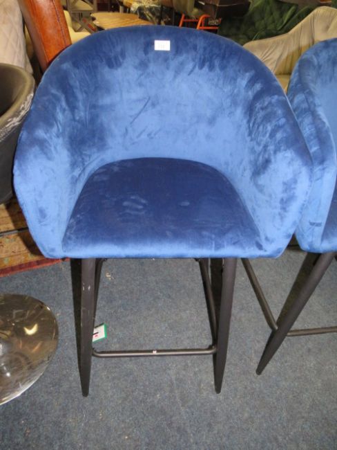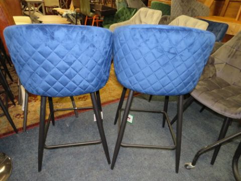 A PAIR OF MODERN BLUE UPHOLSTERED KITCHEN STOOLS