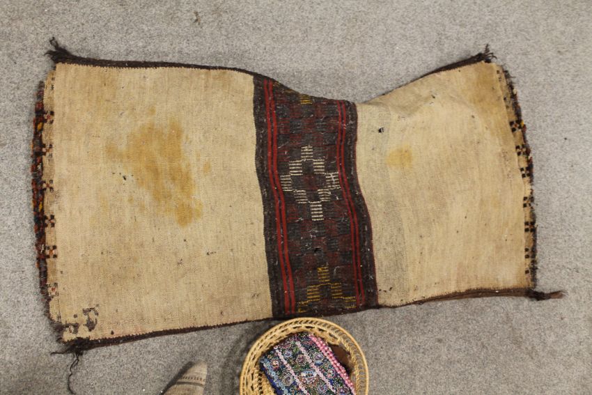 AFGHAN TEXTILE HORSE SADDLE BAG, VARIOUS OTHER TRIBAL TEXTILES, BEADWORK ITEMS AND BASKETS