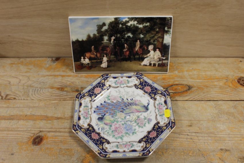 A WEDGWOOD 'THE NOBLE LINE OF WEDGWOOD' FAMILY PLAQUE LIMITED EDITION OF 500 TOGETHER WITH AN OCTAGONAL PEACOCK DESIGN PLATE (2)