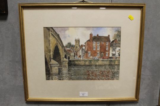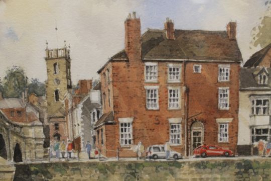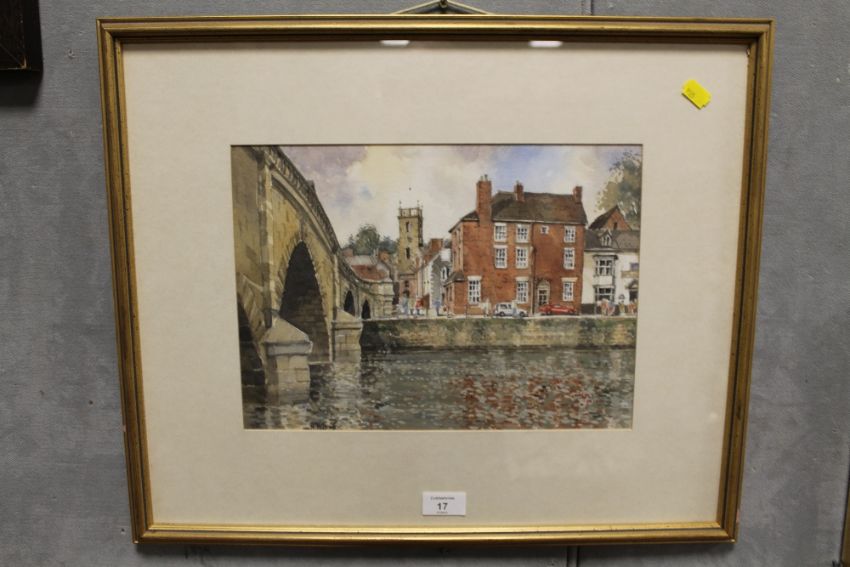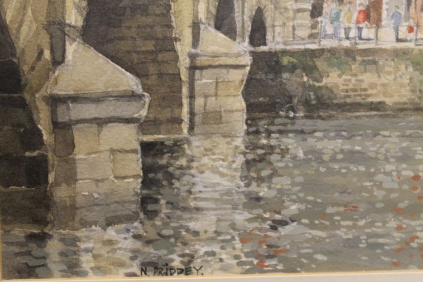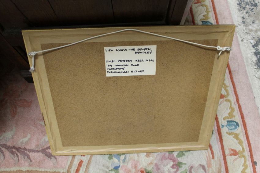 A GILT FRAMED AND GLAZED WATERCOLOUR OF A RIVERSIDE TOWN SCENE ENTITLED 'VIEW ACROSS THE SEVERN - BEWDLEY BY NIGEL PRIDDEY RBSA MSAI SIGNED LOWER LEFT AND INFORMATION VERSO