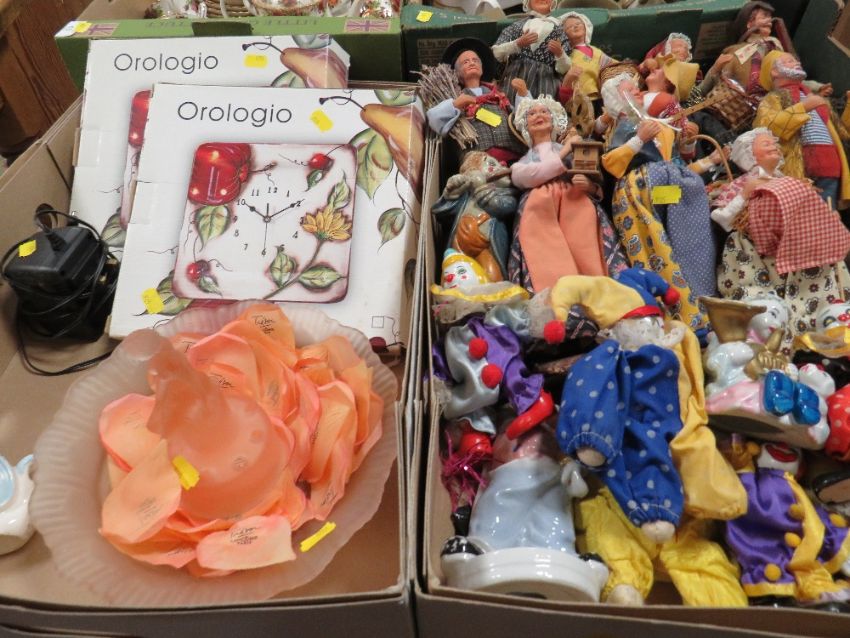 TWO TRAYS OF ASSORTED DOLL FIGURES ETC TO INCLUDE LANCOME PARIS TRESOR SILK STYLE PETALS IN A FIGURAL GLASS BOWL