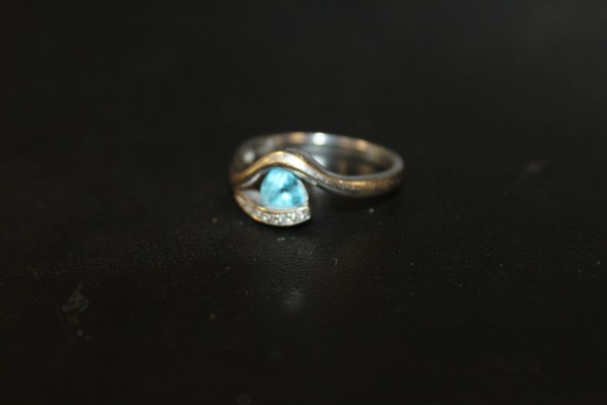 A HALLMARKED 9CT WHITE GOLD SPLIT BAND RING SET WITH BLUE TOPAZ STYLE STONES - APPROX WEIGHT 3 G, RING SIZE M½