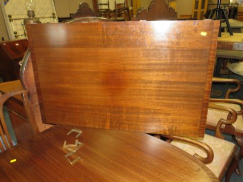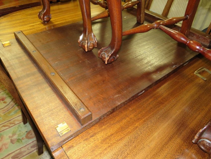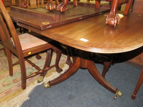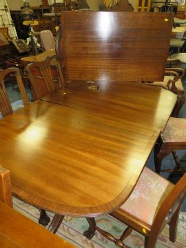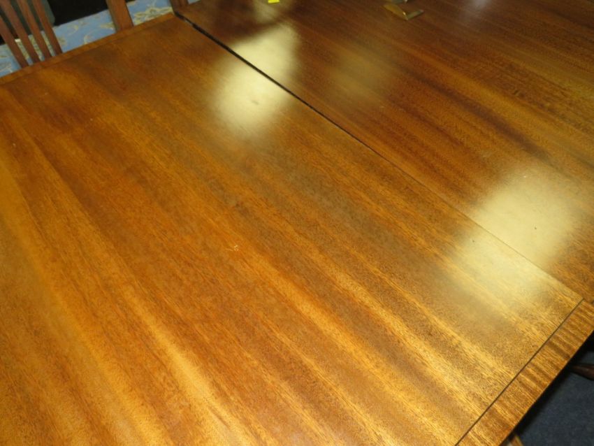 A QUALITY MAHOGANY EXTENDING 'D-END' TWIN PEDESTAL TABLE WITH SIX EARLY 20TH CENTURY CHAIRS