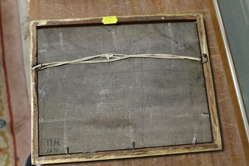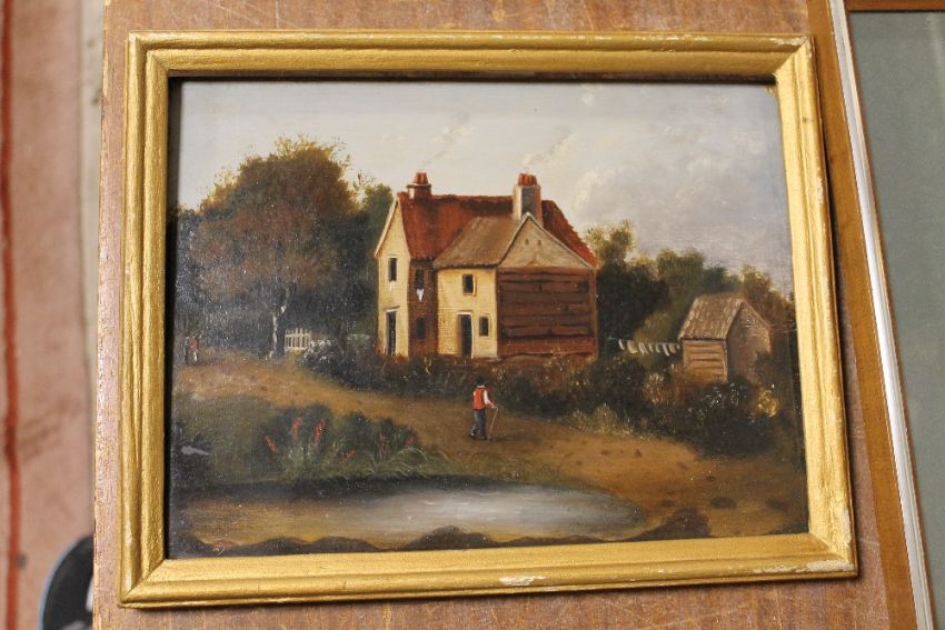 A SMALL 19TH CENTURY TYPE OIL ON BOARD PANEL OF A COTTAGE BY A POND INITIALED W.M 1871 VERSO