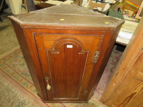 AN ANTIQUE OAK HANGING CORNED CUPBOARD