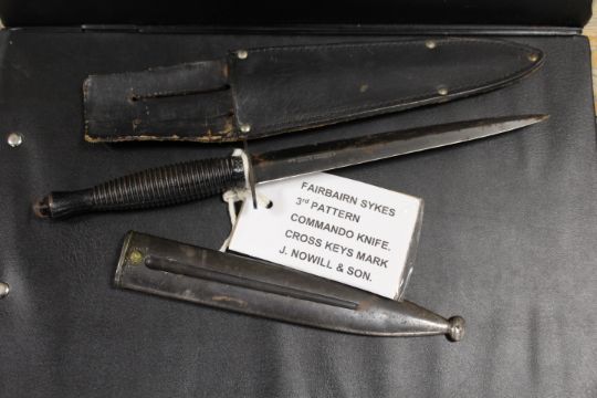 A SYKES FAIRBAIRN 3rd PATTERN COMMANDO KNIFE & WREATH WITH METAL SCABBARD