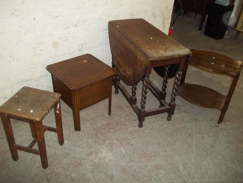 FOUR ITEMS TO INCLUDE AN OAK DROPLEAF TABLE AN OCCASIONAL TABLE ETC