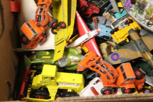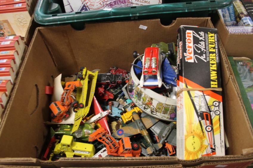 BOX OF PLAYWORN DIECAST TO INCLUDE DINKY, LESNEY, CORGI, MATCHBOOK, TOGETHER WITH TWO BOXED VERON AEROPLANES KITS, TIGER MOTH AND HAWKER FURY